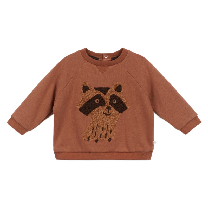 say hello to the cutest, comfiest sweatshirt ever! the arsene & les pipelettes baby raccoon sweatshirt in brown brushed fleece features three snaps for easy dressing, raglan sleeves and ribbed finishes at the collar, cuffs and hem. the bright-eyed raccoon on the front in looped embroidery is everything for this relaxed fit style.