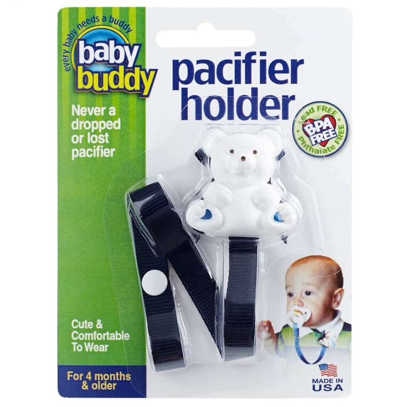 Parents won’t have to constantly bend down to pick up clean pacifiers that fall on the ground anymore with Bear Pacifier Holder from Baby Buddy. It can clip any pacifier to baby’s shirt, car seat cover, and stroller safely and easily, and the other end snaps neatly to the pacifier handle. Babies won’t have to be sad and frustrated because they constantly drop and lose their paci. No more lost pacifiers and no more carrying around multiple binkies because baby keeps dropping or throwing them.