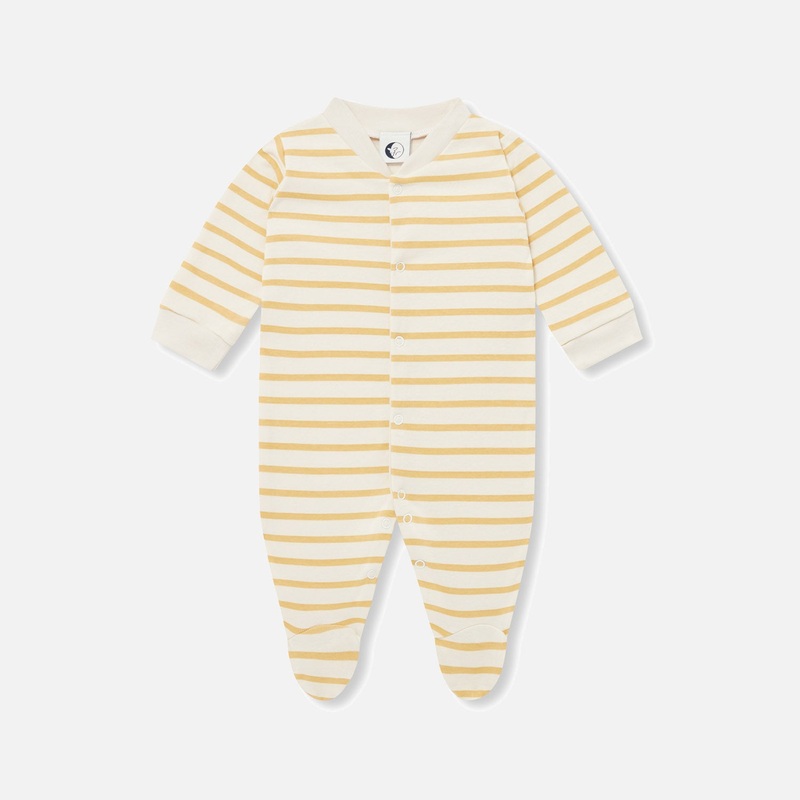 A classic baby sleepsuit in Carmel & Oatmeal Breton print. 100% organic cotton, a very soft interlock fabric for maximum night-time comfort.Made from 100% Organic Cotton.Made in UK.