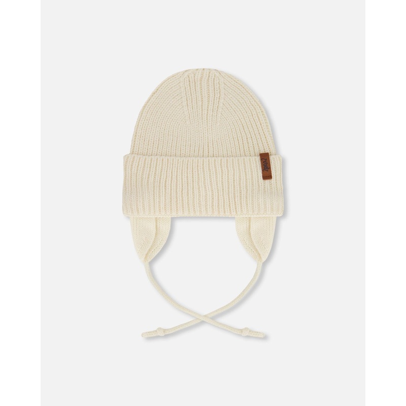 Because it's always important to keep baby's head warm, this knit cap is a must-have for chilly days that require a bit of bundling up. Ultra-soft in acrylic knit with a ribbed texture, this mid-season hat features protective ear flaps, string ties, and a