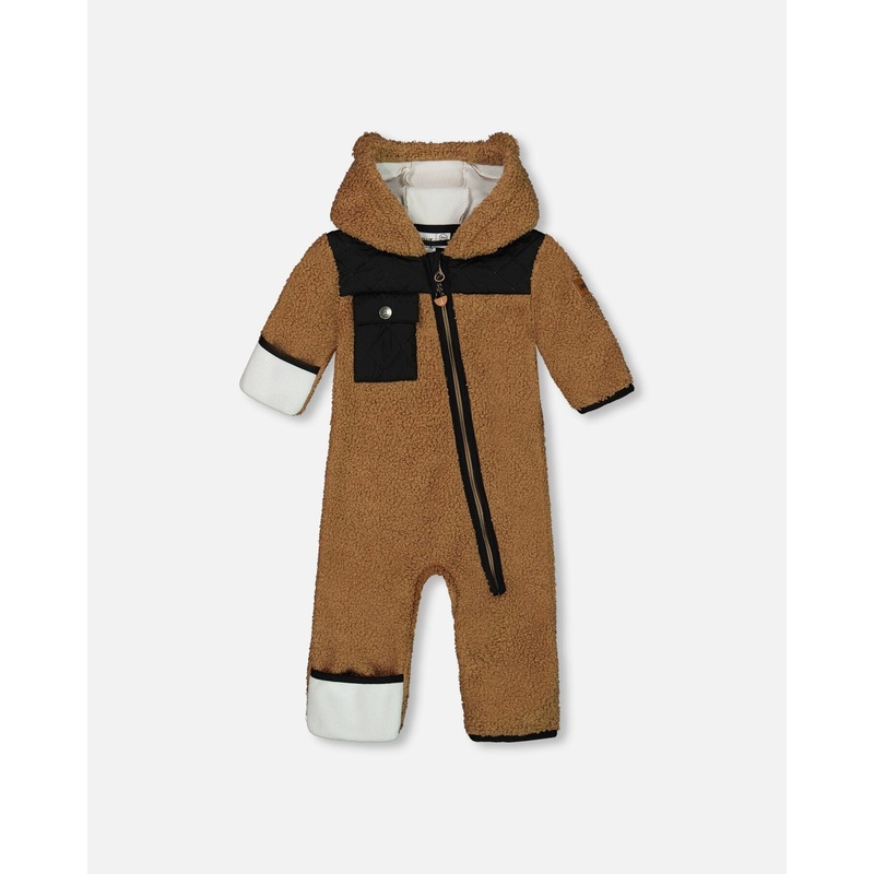 Little ears on the hood add playful charm to our soft and cozy Baby One-Piece Sherpa Mid-Season Outerwear Tan and Black. Accented with a quilted yoke and pocket, this adorable one-piece features an attached hood, an asymmetrical zipper closure, and flip over hands and feet for extra warmth and protection.