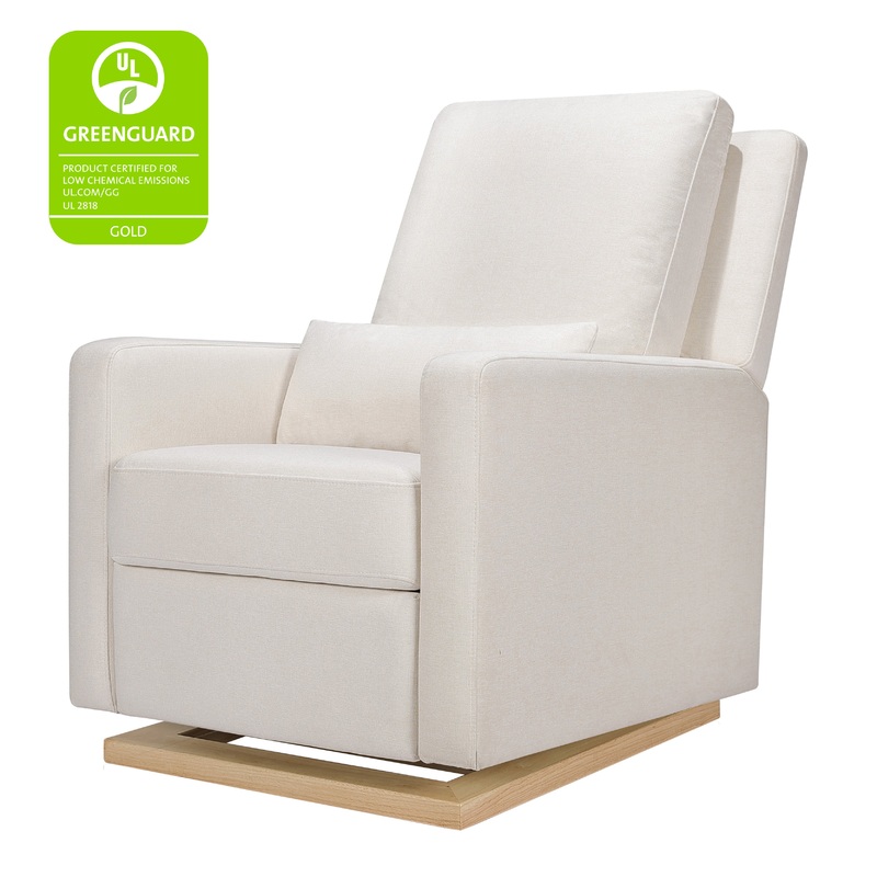 The Sigi Glider Recliner is a stylish choice with its crisp, modern design and comfortable seat on a light wood base. Effortlessly glide back and forth in an upright position to rock your baby to sleep or lean back and relax in the reclined position with t