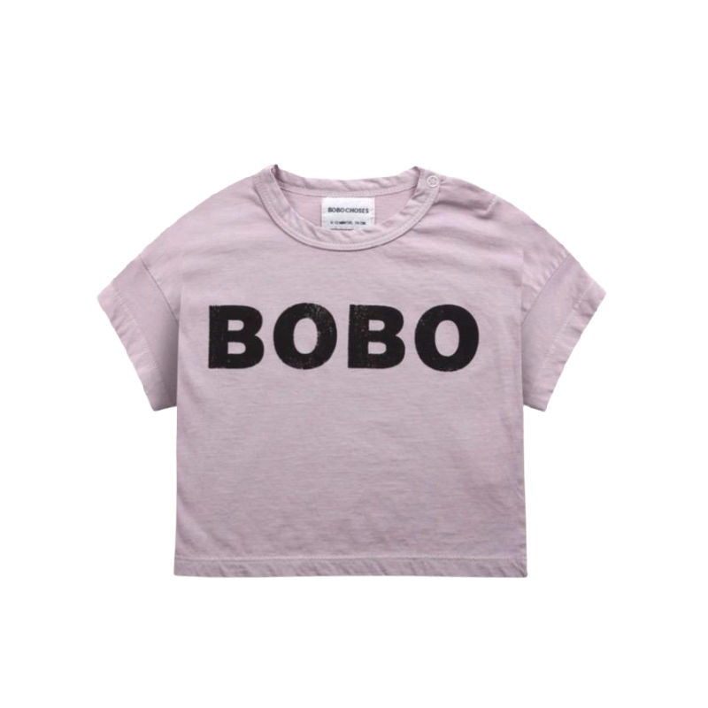 bobo choses short sleeve baby t-shirt in lilachas large black block letters with "bobo" printed on the front and "choses" on the back. features a snap closure at the shoulder for easy dressing.80% organic cotton 20% recycled cottonmade in spainfinal sale
