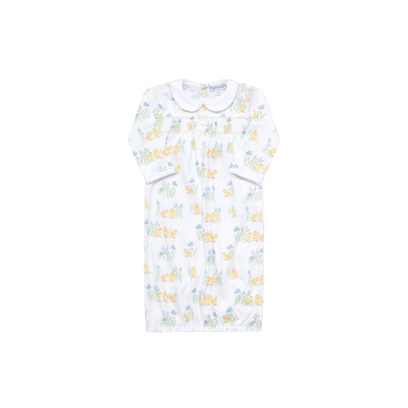 Introducing our sweet and charming Chicks Print Smocked Baby Gownthe perfect addition to your little one's wardrobe!100% Pima CottonMachine washableMade in Per*This beautiful print has come to life thanks to Pearly Gates Designs.
