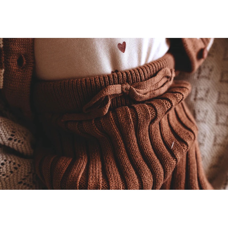 Our Chocolate Knit Ribbed Pants, the perfect complement to our Striped Cardigan, and boys long sleeve bodysuits. Crafted with cozy knit fabric and a stylish ribbed texture, these pants offer both comfort and versatility. Pair them with our matching Striped
