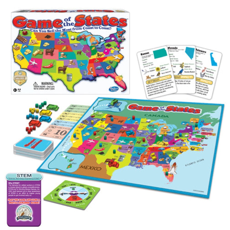 Kids learn all about the United States by racing their trucks across the country buying and selling goods along the way. Players will become familiar with the fifty states, their locations, capital cities, and top products and learn interesting STEM facts about each state!