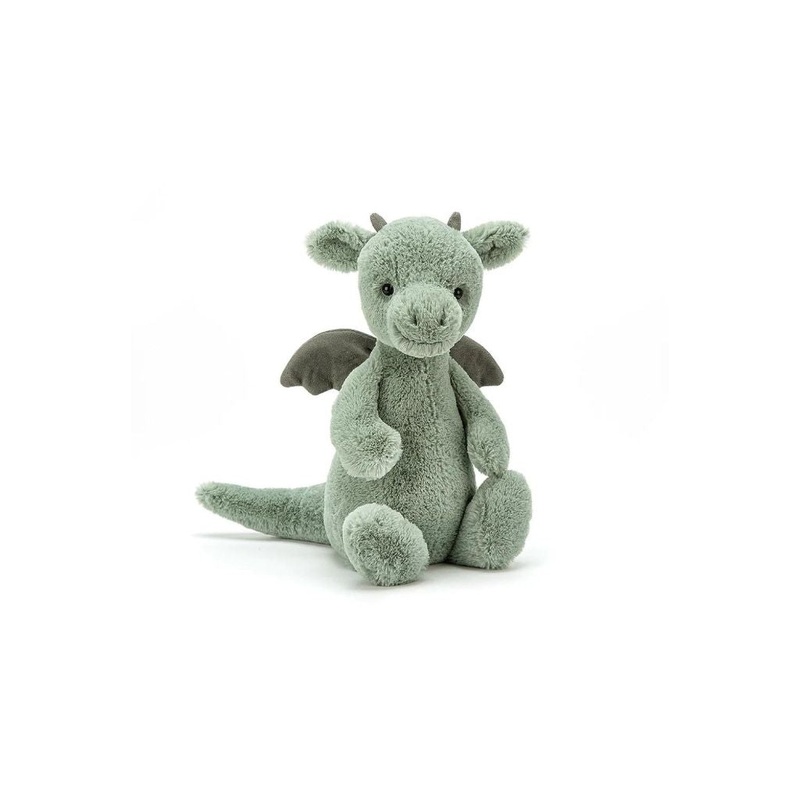 Bashful Dragon is a fierce little friend, with plenty of attitude! With supersoft fur in pale sage green, suedey horns and a long, squidgy tail, this brilliant beastie is pretty fantastic. We love those neat little contrast wings, chunky feet and fine flap