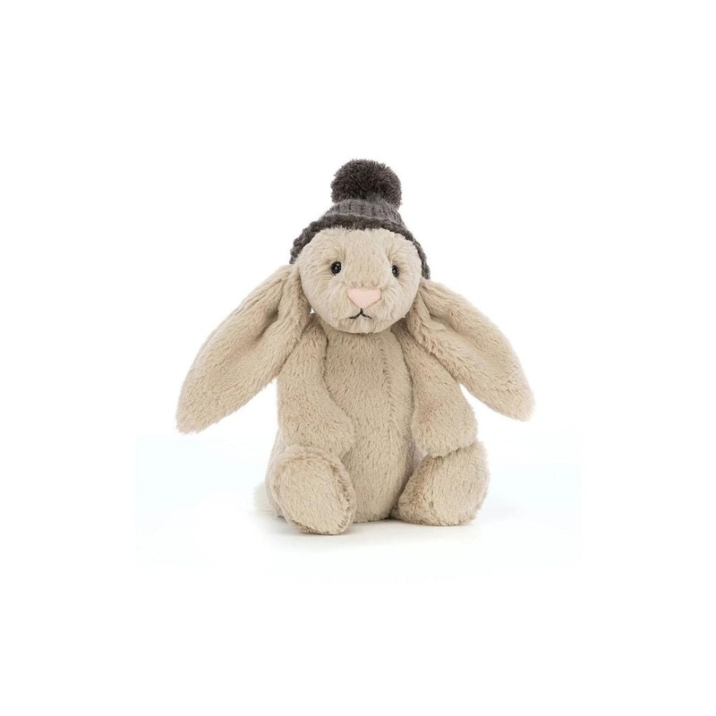 Bashful Toasty Bunny Beige plans to be cheery, even when it's chilly! This stylish bun wears a charcoal hat in warm woollen knit, with a bobble on top! Lucky those ears are lopsy-lovely, so it fits just perfectly. Our bobtail buddy is snuggle-soft with bis