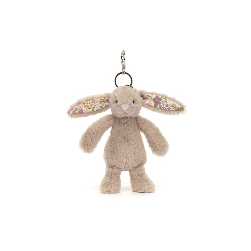 Blossom Beige Bunny Bag Charm has brought along some special flowers to brighten your day! In iconic Bashful beige fur with a cream bobtail, this pocket-sized Blossom Beige Bunny has soft cotton floral ears, printed with an original Jellycat design of pink and purple flowers. With a silver clasp to attach to any bag, this bunny brings the joy!