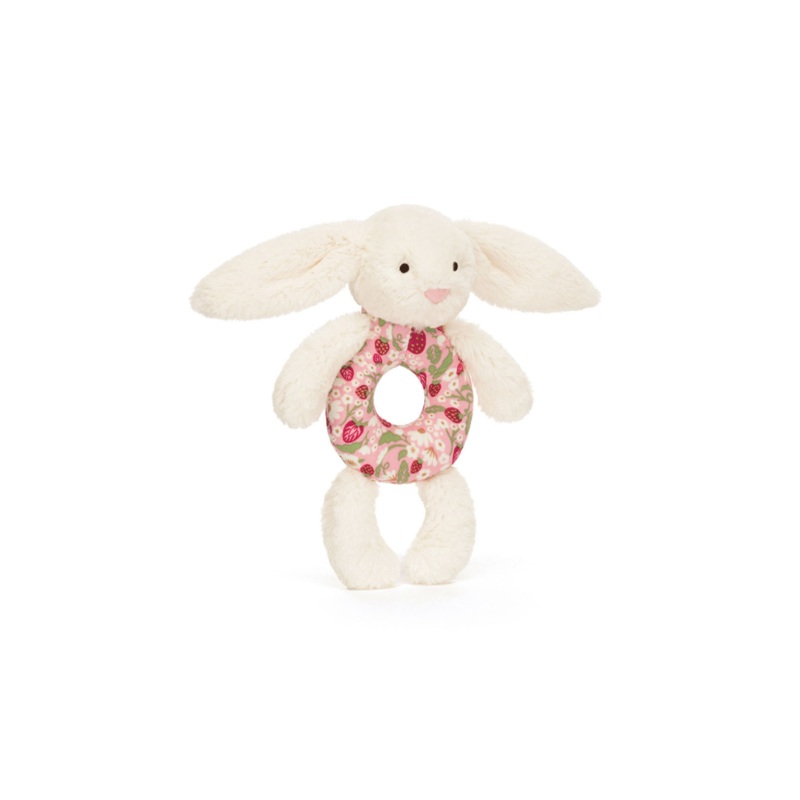 A treat for tiny hands, Blossom Cream Bunny Berry Ring Rattle can be grabbed by its soft paws, long lop ears or ring-shaped tummy. When given a gentle shake it will sound the rattle inside, much to babys delight! Crafted in a cream coloured fur made from recycled fibres with a strawberry patterned tummy in an original Jellycat design, featuring a Bashful Bunny pink suedette nose and embroidery eyes.
