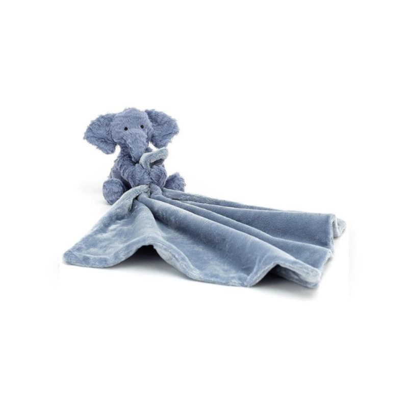 Jellycat Fuddlewuddle Elephant Soother is a blue elephant soother. Scrumble-stomping into the playroom, it's the Fuddlewuddle Elephant Soother! This thoughtful elly has wrapped up in ribbon a sky-blue square of softness to snooze on! A perfect match for th
