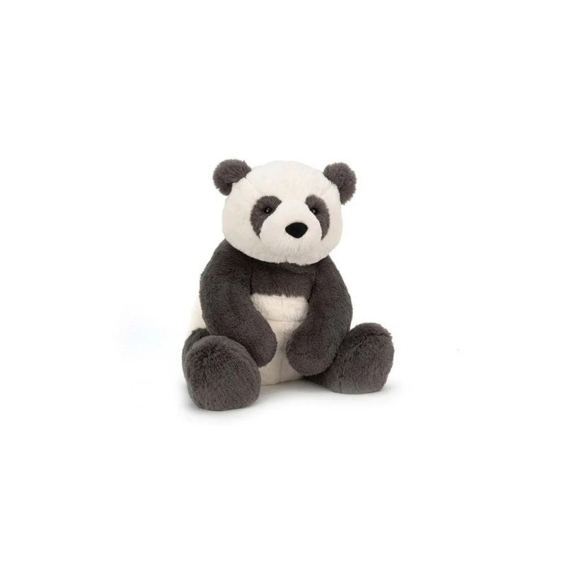 Tubby and ticklish, Harry Panda Cub is such a cuddly chap. His charcoal-grey and creamy fur is velvety-soft and so beary snuggly. Harry's beany feet help him sit up, and his lollopy legs swing about when he's carried. We love his bobbly tail the best!SAFET