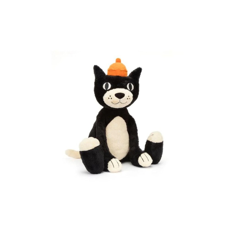Jellycat Jack is finally here! This tuxedo cat has soft tufty fur, huge stitched paws and a friendly smile. With a long curved tail and L-shaped paws, Jellycat Jack has a soft velour crown of iconic orange jelly!