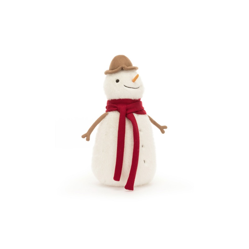 Jesse Snowman has fuzzy cream fur, cord stick arms with textured ends and a suedette hat with a notch in the brim. Jesse wears a long scarlet scarf, wrapped twice around for good measure. With safe stitch buttons, a weighted base, a cord carrot nose and a cheerful grin, this snowman is pretty magical.