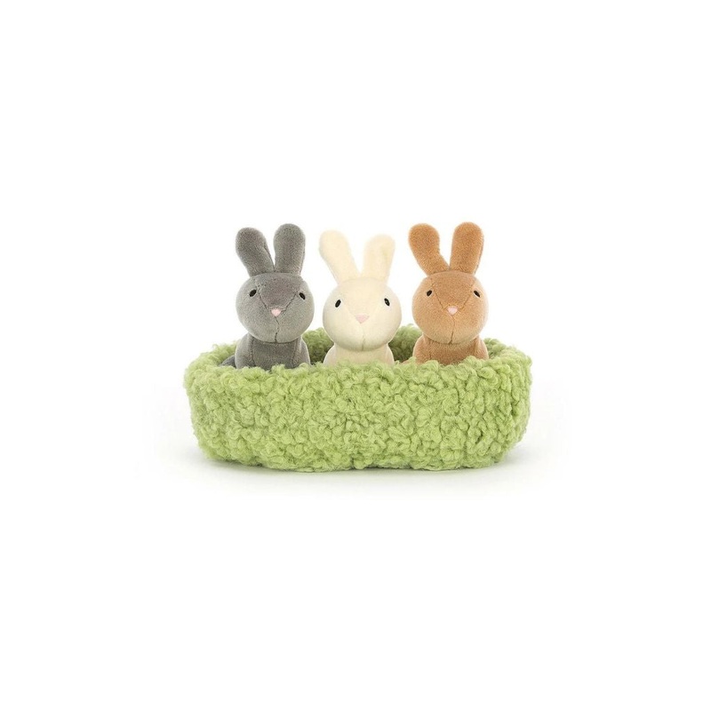 What’s better than one cheery bunny? Three, all huddled together! The Nesting Bunnies are a tickly trio, in pebble, vanilla and tawny stretch fur. These perky poppets love to hang out in their fluffy mossy nest! With perky ears, eager expressions and snowy bobtails, this loveable litter can’t wait to meet you!ONE SIZE – H10 X W15 CM