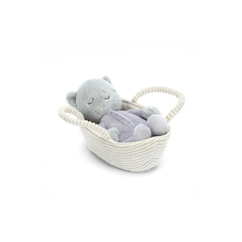 Deary me! Rock-a-Bye Kitten just can't stay awake! Time to hop into that cosy oatmeal basket, with chunky rumples and a soft suedey lining. This gentle grey poppet wears a lavender onesie with a fluffy tail just peeking out! Tuck this tiny pal in for sweet