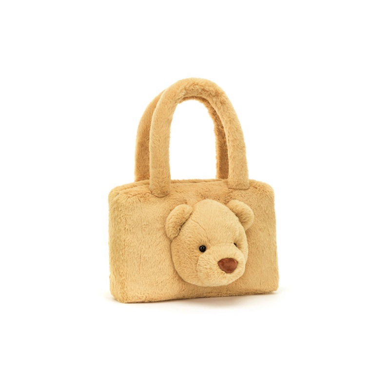 Keep your belongings nice and cosy with the Smudge Bear Tote Bag. This whimsical tote has honeycomb fur with a cotton lining, silver zipper and metal Jellycat tag. A chunky bear face pops out from the front, with cute round ears and a fudge suedette nose.