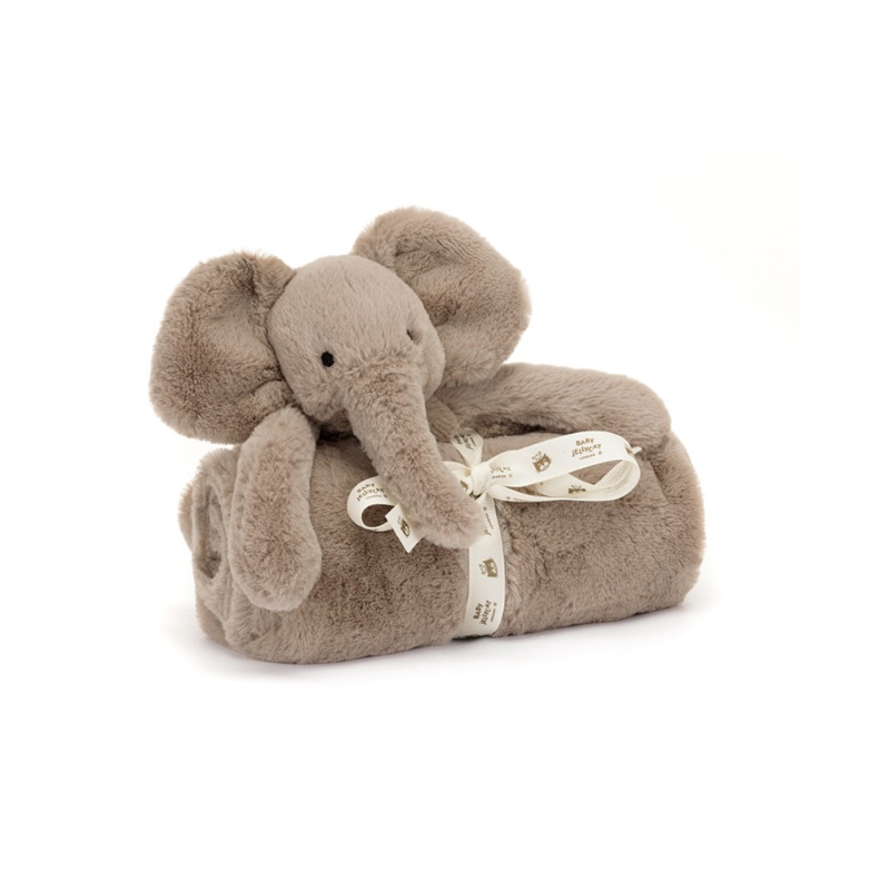 A gorgeous gift to welcome any newborn in style. The Smudge Elephant Blankie is dreamy soft in a rich, warm grey fur. Our floppy-eared elephant peeps over the corner of a luxurious un-stuffed blanket with squashy paws for little hands to hold. Presented in