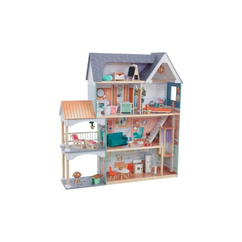 Fascinate curious kids with hours of imaginative play with the KidKraft Dahlia Mansion Dollhouse with EZ Kraft Assembly! Standing over four feet tall and featuring four levels of play, six rooms and a roomy carport, this dollhouse is spacious enough to hou