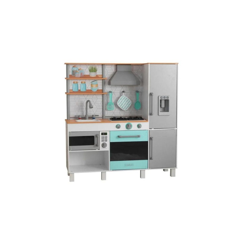 Serve up hours of imaginative fun for aspiring chefs with the KidKraft Gourmet Chef Play Kitchen! Featuring a spacious refrigerator with play ice maker, a deep freezer and a microwave with a showcase door, this modern kitchen has everything gourmet chefs need to make mealtime deliciously fun. Three interactive knobs click when firing up the extra-large oven and cooktop with chic ventilation hood. Youngsters can learn practical skills as they play with the sinks red and blue labeled handles to indicate hot and cold water. The included spoon, spatula and pot holder have their very own hanging pegs above the stove, and the shelf space above the sink makes learning to organize fun and easy. With the KidKraft Gourmet Chef Play Kitchen with EZ Kraft Assembly, kids are bound to create tasty memories as theyre transformed into little chefs. Parents will love how fast and easy it is to assemble this play kitchen with our innovative EZ Kraft Assembly technology, which means less building time and more playing time!