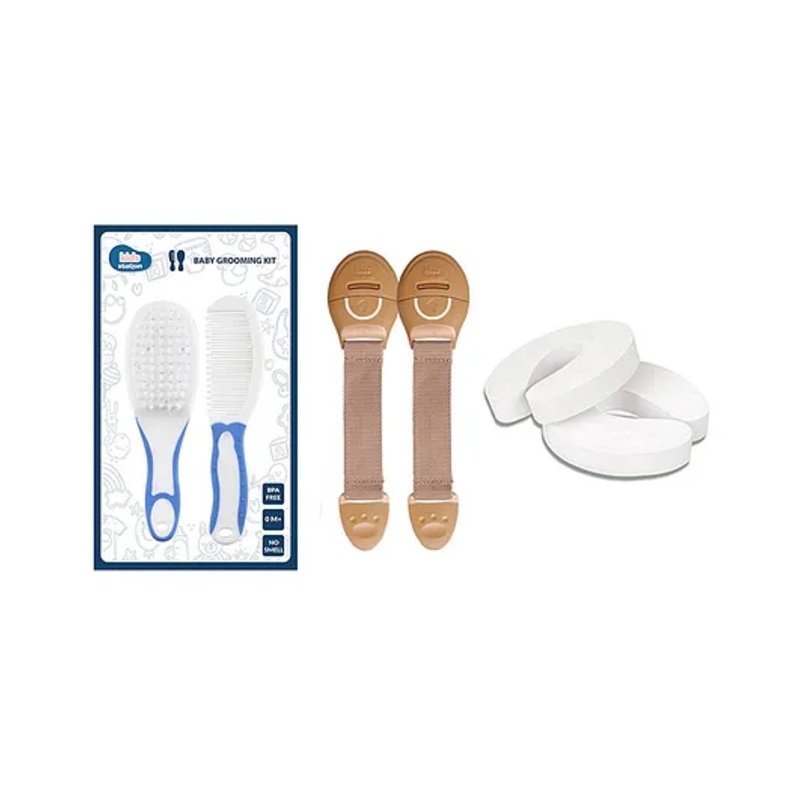 Product DescriptionThe Kids Station Baby Safety & Grooming Combo Pack is a must-have for child and pet safety. It includes baby-proofing finger pinch door guards, safety locks, and a grooming kit, ensuring protection and hygiene for your little one. Made from high-quality, non-toxic materials, the set helps prevent door accidents and keeps your baby clean and well-groomed. Perfect for home use and travel, this combo pack is a great addition to any nursery!Items Included in the Package2 door guards, 2 safety locks, pack of 2 grooming kit