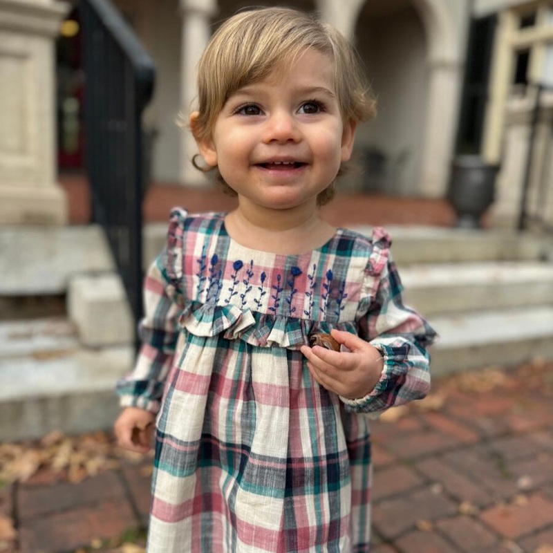 This adorable dress has a timeless A-line silhouette and a sweet ruffled embroidered placket. Available in our gorgeous pink and blue check fabric. With matching bloomers in baby sizes 0-24 months.