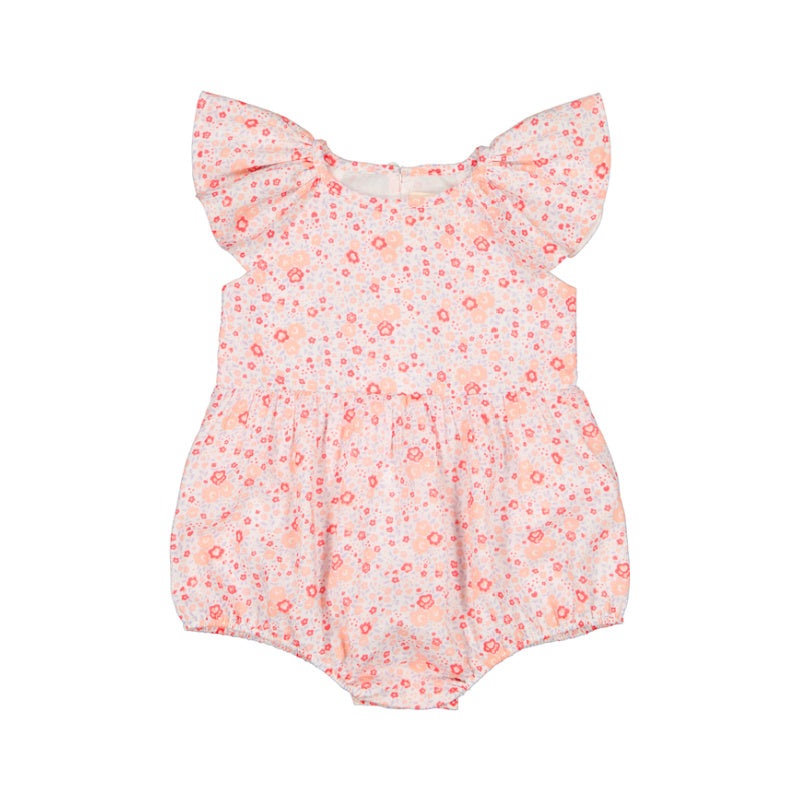 louis louise romatic flower baby overall made with soft cotton voile. it features pretty red flowers on a pink background and has cap sleeves and a gathered waist for a feminine touch. the push snaps closure makes dressing and changing a breeze.