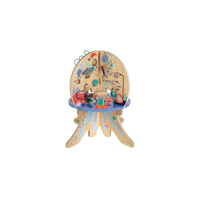Named by the Toy Association as a Finalist in the Infant/Toddler Category! This wood activity center is packed full of exciting features! Includes 4 quadrants in the shape of a jellyfish with a variety of activities for baby: gliders, bead runs, spinning gears, springy coral and clacking clams.TheDeep Sea Adventureoffers seated and kneeling play for young toddlers. Although hefty in construction, it is not designed to provide standing or pull-up support. Standing play is only recommended for children able to stand unassisted.