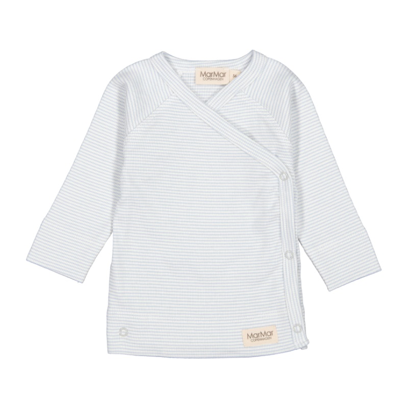 marmar copenhagen long sleeve tuti wrap top in fresh air stripe. the top features push buttons for closure and easy dressing.47% organic cotton 47% tencel modal 6% elastane