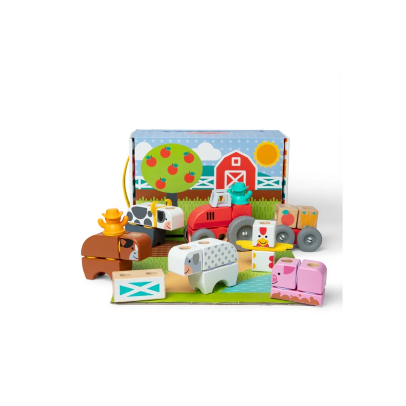 Melissa & Doug Blockables are connectable, stackable, and playable! The solid wood connect-and-play building blocks are perfect manipulatives to help preschoolers two and older boost developmental skills (fine motor, problem-solving, matching, storytelling, and self-esteem), while using their imaginations and having fun. Easy-to-grasp smooth, colorful wooden blocks fit together in a snap with large connectors that even little hands can push in and pull out. An illustrated guide shows how to arrange and link the Blockables to create multi-textured farm animals and equipment (a tractor and trailer, cow with felt horns, sheep, pig, horse, chicken with felt wings, food, and a hay bale), or kids can use their imaginations to mix, match, and combine pieces to make unique creations and play their own way! Kids can easily expand their collection — the 56-piece Farm Play Set is compatible with all other Blockables play sets. The packaging folds out to convert into a fun play space and pieces store in the sturdy corrugated box with a soft handle for easy cleanup and portability. Patent pending.