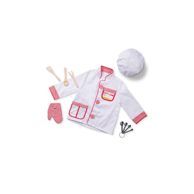 With a machine-washable chef jacket and hat, your little chef will be master of the pretend kitchen! This set comes complete with a set of measuring spoons, two wooden utensils, an oven mitt and a name tag for personalizing.