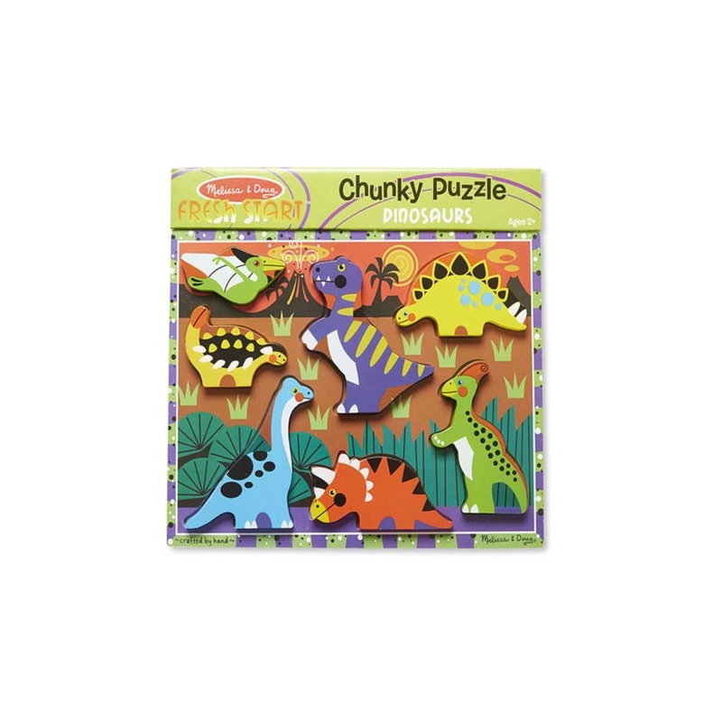 This extra thick wooden puzzle includes seven easy-grasp, chunky dinosaur pieces with a full-color, matching picture underneath. The dino pieces stand upright for pretend play. Encourages eye-hand, fine motor and creative expression skills.Extra-thick wood