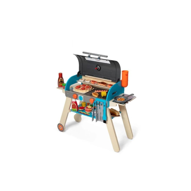 Fire up imaginative pretend play with a wooden BBQ grill, smoker, and pizza oven play set, complete with wooden and felt play food and condiments, durable utensils, frying pan, and wooden pizza paddleIncludes wooden sliceable play food pieces that look unc