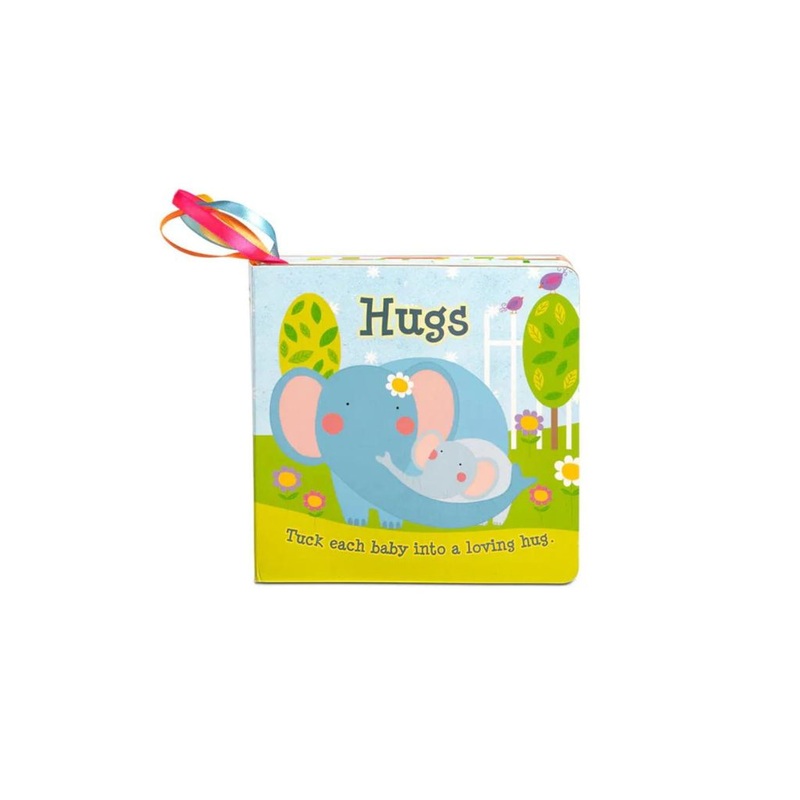 Hugs board book with pockets and attached play tags12-page book with rhyming story helps kids match babies to their grown-up counterpartsFive play tags (penguin, lion, elephant, monkey, baby) are tethered to book with colorful ribbons so they wont get lost