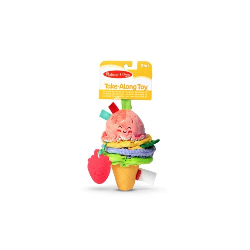 This super-sweet clip-on vibrating pull-toy is a delicious way to entertain babies while stimulating their senseswithout the sugar rush! It looks like a soft, smiling ice cream cone, but pull it down and it expands to four stacked scoops in different patterns, colors, and textures (cotton, corduroy, and quilted materials). When baby lets go, the cone vibrates and plays chiming sounds as it jiggles its way back to a single cone! Attached are a textured strawberry and ribbons to rub. Bring the fun wherever baby goesthe self-stick strap lets you easily clip the all-in-one, multi-textured toy onto a stroller, car seat, diaper bag, or high chair to keep it close at hand. Melissa & Doug infant and toddler toys inspire a-ha! moments of discovery. Adorable, diverse characters and a variety of fun shapes and textures encourage exploratory, skill-building play.