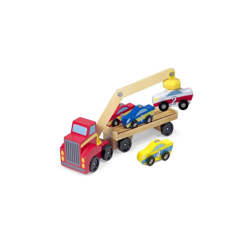 This big red rig has a magnetic arm that can reach every car on its trailer! It's one terrific wooden vehicle set with so much to offer: Link up the trailer to the car carrier to take the four magnet-topped cars for a drive, then unload each one at its des