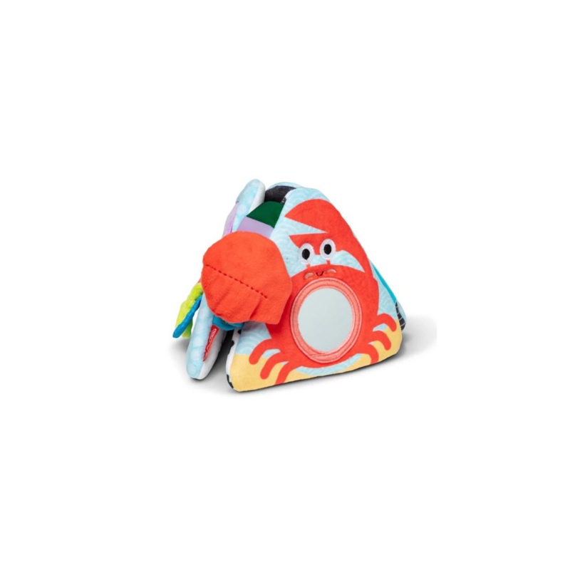 Make babys tummy time extra special with this engaging, double-sided folding cloth triangle toy! Three fold-out panels with adorable ocean-themed graphics and friendly characters lie flat or fold and connect into an upright pyramid. One side features high-contrast black and white graphics, great for important visual stimulation during babys first months. The other side includes colorful sea creatures with developmentally appropriate features, like a crab with a peek-a-boo mirror and squeaker, sensory tabs and ribbons on the jellyfish, and an attached tuck-away fish that stores in a pocket! The Tummy Time Triangle helps baby stay engaged and strengthen muscles during tummy play. Its a great addition to registries and makes a great gift for newborns through six-month-olds for screen-free, hands-on interaction and skill-boosting play.