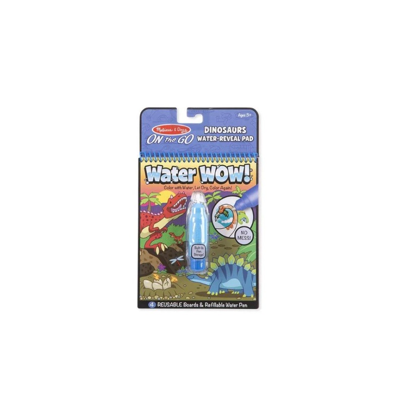 No-mess painting for kids! This exciting paint-with-water coloring book includes four reusable pages and a refillable water pen. Simply use the pen to color in each scene details and vibrant color appear with every stroke! Then let the page dry to erase the pictures and color it in again and again. This dinosaur-themed book includes four scenes to color, and a search-and-find activity for each scene. The chunky-sized water pen is easy for kids to hold and stores neatly right in the front cover, making this Water WOW! an ideal travel activity book and travel toy for kids!