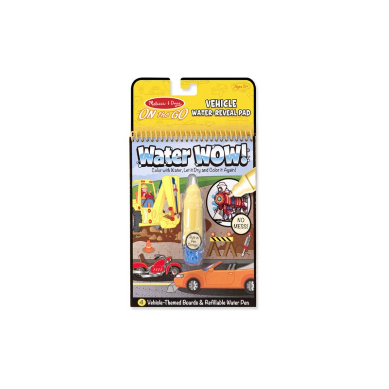 No-mess painting for kids! This exciting paint-with-water coloring book includes four reusable pages and a refillable water pen. Simply use the pen to color in each scene–details and vibrant color appear with every stroke! Then let the page dry to erase the pictures and fill it in again and again. This vehicle-themed book includes four scenes to color and a search-and-find activity for each scene. The chunky-sized water pen is easy for kids to hold and stores neatly right in the front cover so Water WOW books make ideal travel activity books and travel toys for kids!