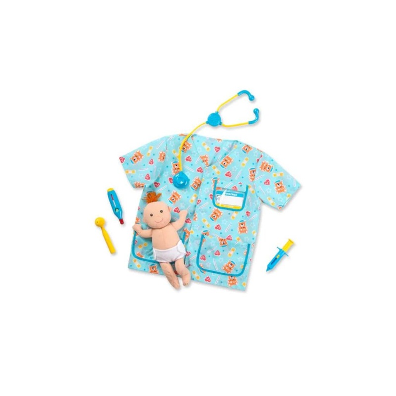 This pediatric nurse costume and play set has everything little nurses need to take care of a newborn baby--including the baby! Nurses-in-training can slip on the cheerful, gender-neutral uniform (complete with customizable hospital ID tag), then fill the