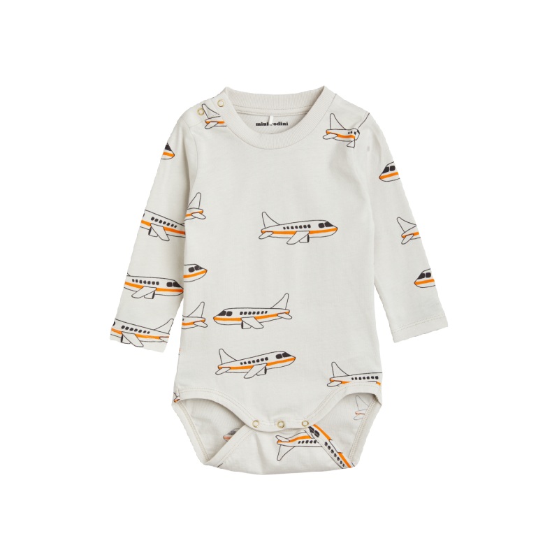 mini rodini airplane aoplong sleeve baby body in greywith an all over airplanes print. features snap buttons at the shoulder and crotch for easy dressing. 100% GOTS certified organic cottonfinal sale