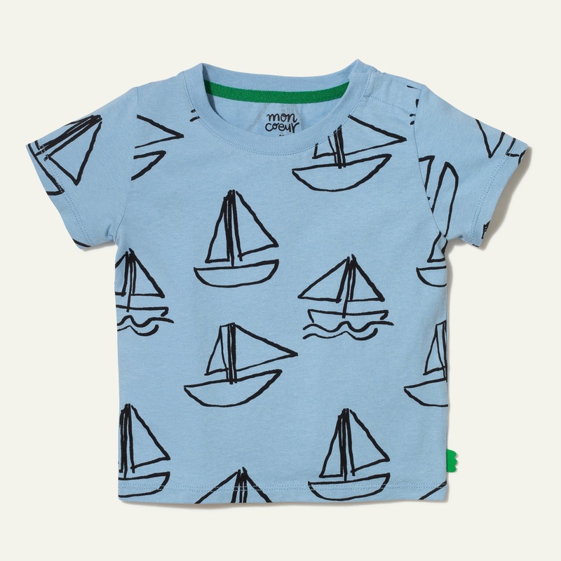 Our soft jersey t-shirts are sustainably made with up-cycled cotton using watercolor print and non-toxic inks. Set sail in this breezy t-shirt in placid blue featuring our sailboat print, ribbed neck and short sleeves. Pair it with the coordinating short o
