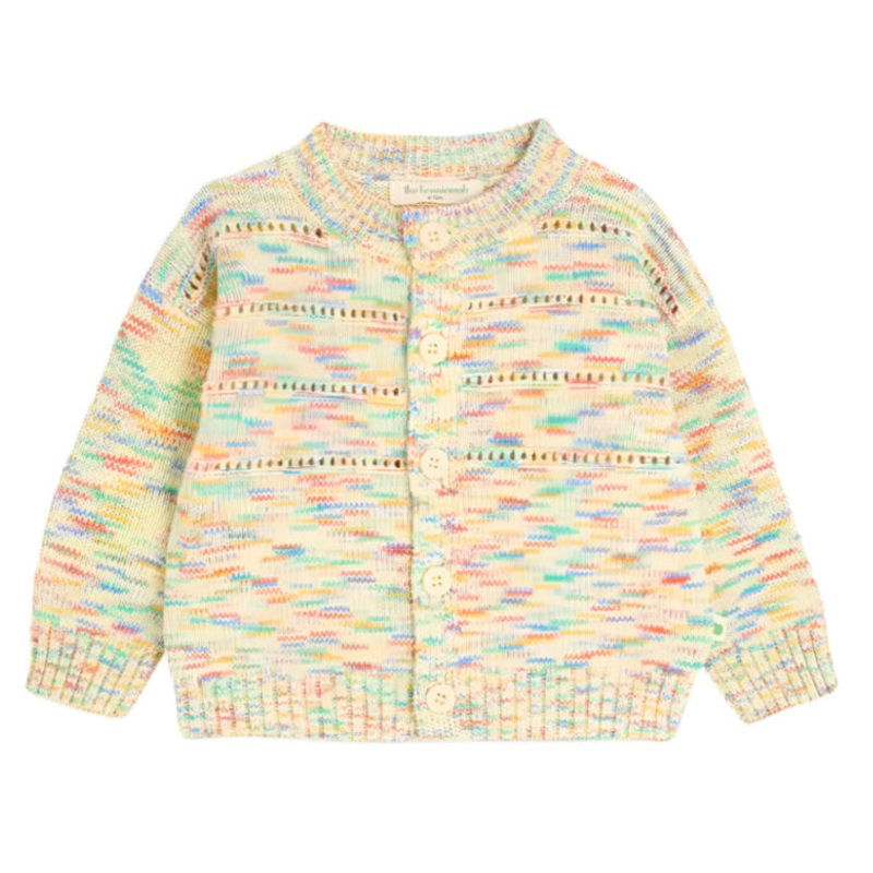 the bonnie mob space-dye baby and kids cardigan crafted from 100% GOTS certified organic cotton. this beautifully soft cardigan is made with a unique rainbow space-dyed yarn and is designed with both style and sustainability in mind. it features a vintage, hand-knit feel with traditional pointelle stitches at the chest. cuffs are designed to be turned back to allow for extra growth.