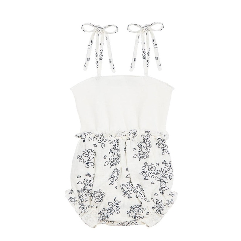 the new society athena short baby romper.torso is in off white stretchy cotton and bottom made with off white linen featuring all over navy rose print. gathered at the waist and legs for a comfortable and snug fit.