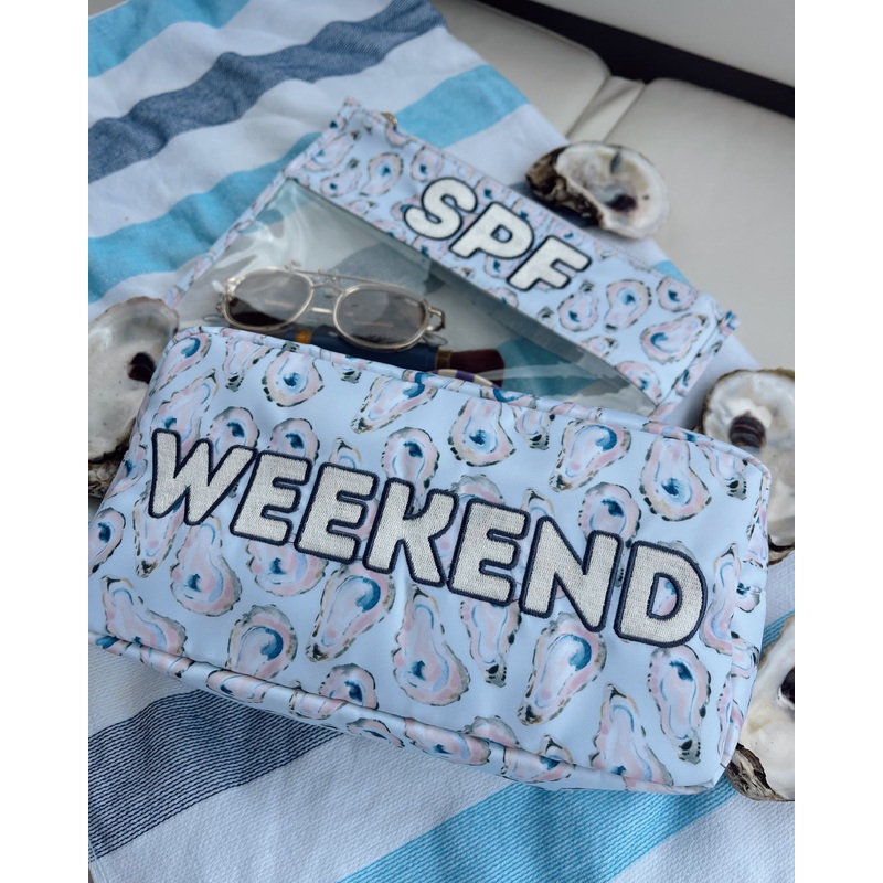 The perfect bag for all summer on the lake, beach & more - blue seersucker oyster print with embroidery!Oyster Artwork by Sami Mancini // @samimanciniartShips immediately!Perfect to pair up with our SPF clear pouch!In collaboration with Aubrey Schoenekase!