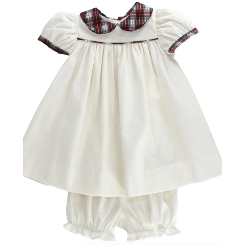 100% cottonThis Float Dress set brings holiday magic to your little ones wardrobe. Featuring crisp white corduroy and cheerful Yuletide plaid details, the dress pairs with matching bloomers for a complete and comfortable outfit. The lightweight design allo