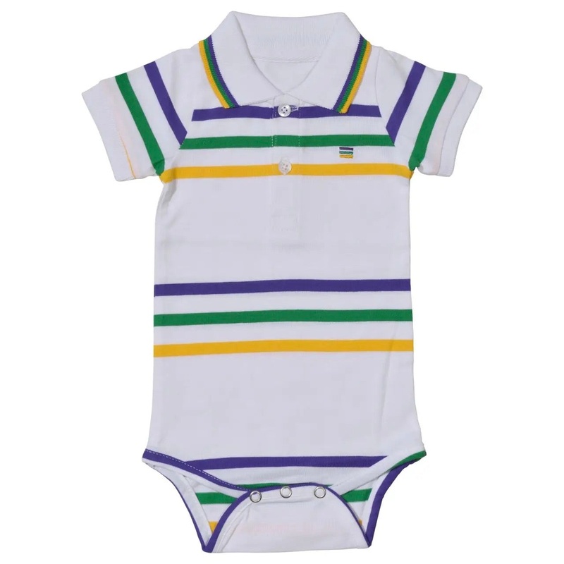 Celebrate Mardi Gras with this stylish white short sleeved onesie with purple, green and gold small infinity stripes. This onesie features thin purple, green and gold solid stripes. Small lines of purple, green and gold are around the edge of the collar. T