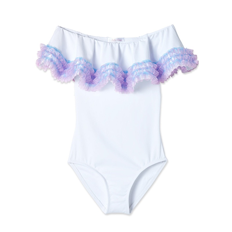 White swimsuit with bouncy anemone fringe for a festive party pool look with matching accessories and matching bikini for girls. This swimsuit looks great with the MIAOW swimming goggles for girls and the colorful friendship bracelets.* fully linedThe Stel