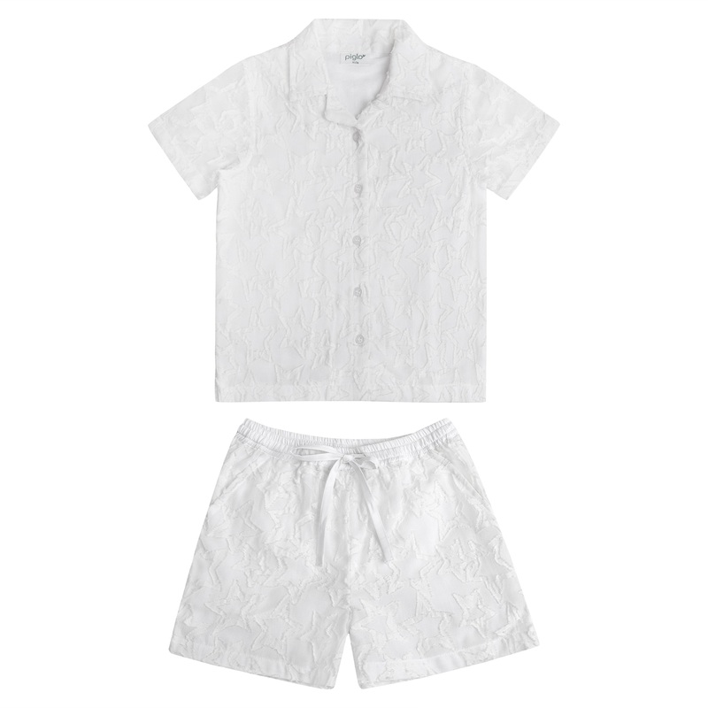 The white Stars Shirt and Bermuda Shorts Set designed for stylish baby boys' clothingFeatures a white star-patterned shirt that adds charm and fun to any outfitComfortable Bermuda shorts with an easy fit, perfect for summer adventuresMade for everyday play