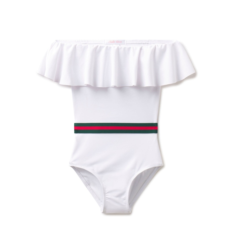 Best selling bathing suit for girls style with draping which can be worn on or off shoulder plus belt for extra coolwith matching cover-ups for girls and looks great with the matching strawhats.soft fabricsfully linedThe Stella Cove collection of beachwear